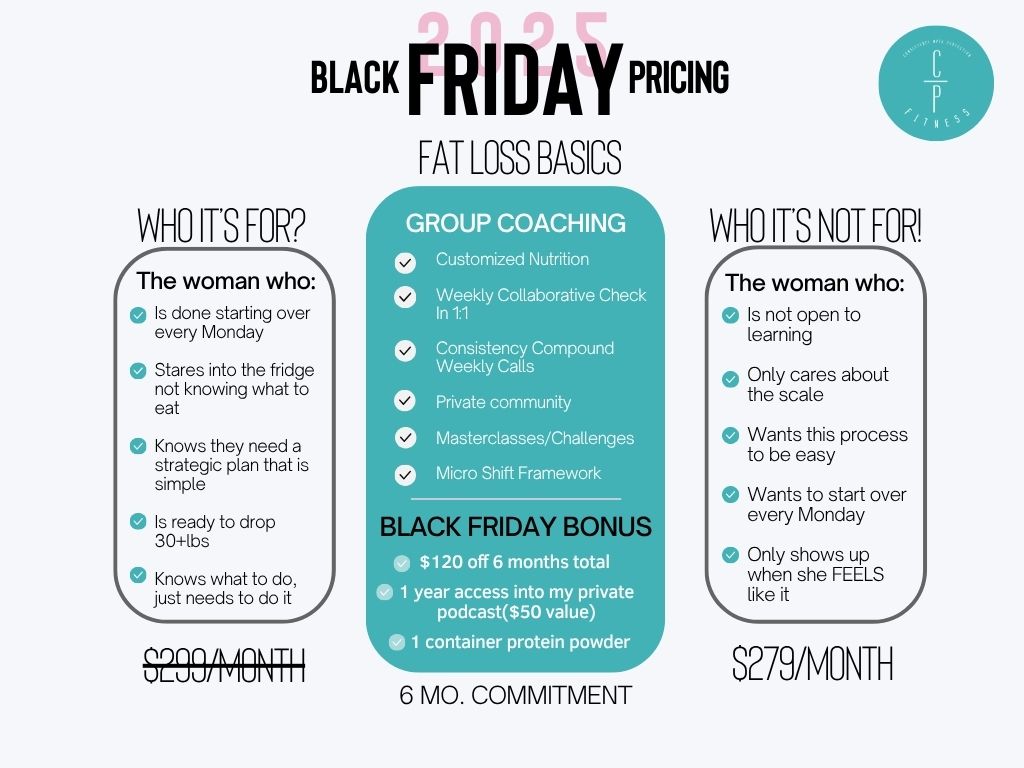 If you decide throughout your time at Fat Loss Basics group coaching to get 1:1 access to your coach, please reach out to [email protected]